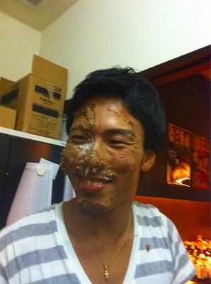 ケーキを皆で分けて食べ、1切れ余ったので、井上が顔面ケーキと言い出したので、堂も前髪をくくり、